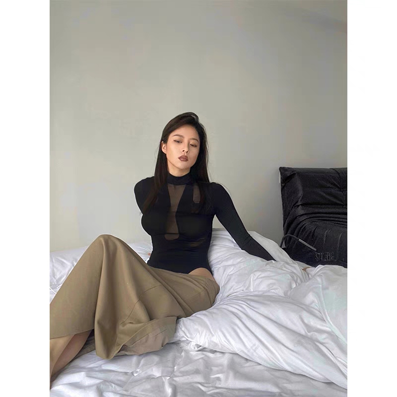 Turn right/陳大腿 性感网纱拼接不规则镂空连体衣女修身显瘦T恤